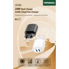 Тип Сетевое зарядное устройство Производитель TOPOMAX Модель TTC-N20 Функция быстрой зарядки Fast Charger Разъёмы: 2USB, Выход: 2,4А Макс. мощность 10W Цвет: черный