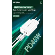 Тип Сетевое зарядное устройство Производитель TOPOMAX Модель TTC-F203AC Функция быстрой зарядки Fast Charger Разъёмы 1USB-А, 1USB-C Выходная мощность 45W, Цвет белый