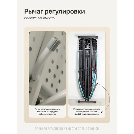 Подходит для правшей и левшей. Доску можно плавно регулировать по высоте. Регулируемые опоры служат для устойчивости доски на неровном полу.
