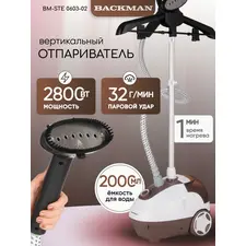 Характеристики Модель BM-STE 0603 Серия Бренд Backman Артикул производителя BM-STE 0603 Основные характеристики Тип отпариватель Вид напольный Объем резервуара для воды, в л 2 Съемный резервуар для воды Да Максимальная температура нагрева, в °C 100 Мощность парового удара, в...