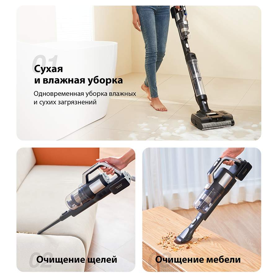 Одно нажатие кнопки позволяет переключиться с вертикального моющего пылесоса на портативный пылесос с ручным управлением. Благодаря множеству аксессуаров в комплекте можно легко очищать пол, кровать, диван и многое другое.