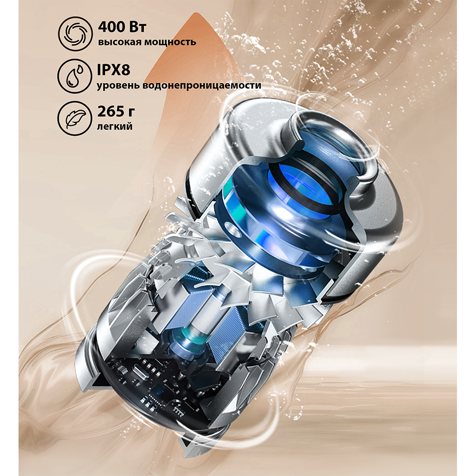 Преимущества Мощность всасывания 100 аВт, Самоочистка и сушка горячим воздухом, Съемный аккумулятор, Двигатель IPX8 мощностью 400 Вт, Комплектация 3 в 1, Портативная конфигурация для уборки мебели