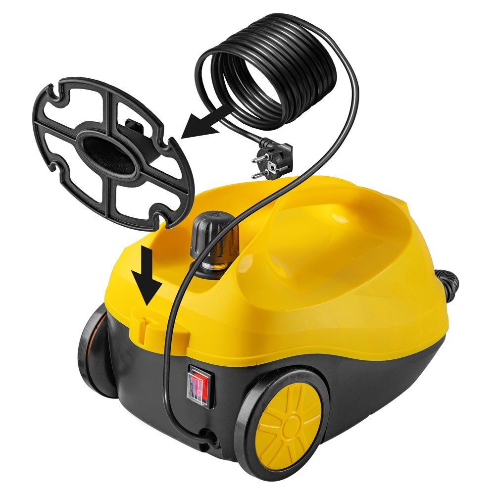 Пароочиститель, Гибкий удлинительный шланг, Насадка для пола, Удлинительные трубки, Круглая щетка с полимерной щетиной, Круглая щетка с металлической щетиной, Большая насадка-распылитель, Мерный стаканчик, Тканевый чехол для ткани, Тканевая накладка для пола, Насадка-скребок для мытья стекол / зеркал, Насадка для отпаривания, Катушка для шнура, Насадка для ковра, Чехол для аксессуаров, Руководство по эксплуатации, Гарантийный талон