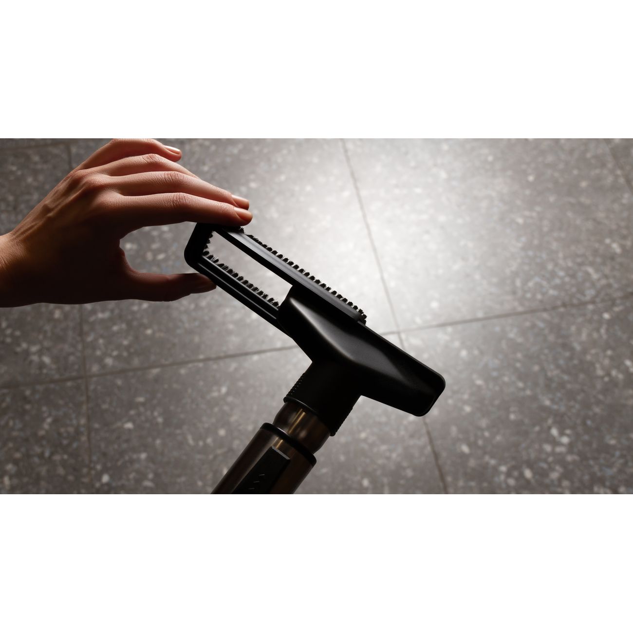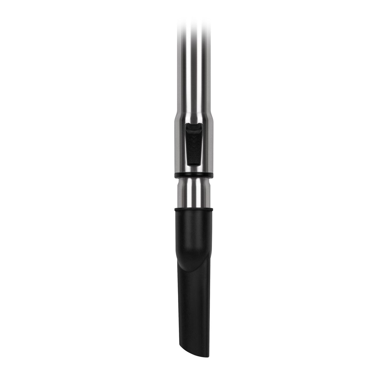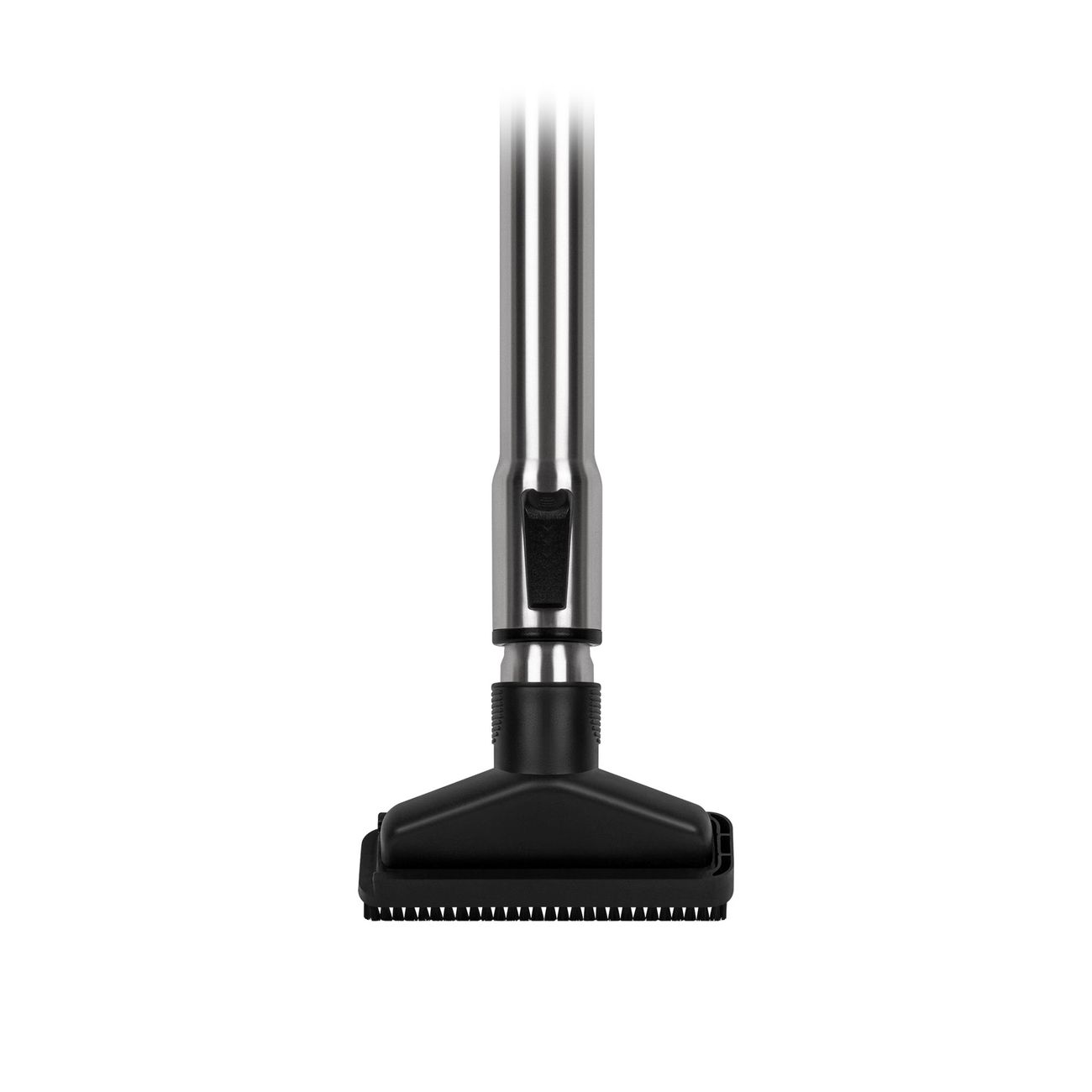 Потребляемая мощность составляет 1600 Вт. На конец телескопической трубки, выполненной из алюминия, крепятся насадки: корпусная, пол/ковер, щелевая. Прорезиненные колеса и ручка упрощают процесс транспортировки. Парковка может производиться в вертикальном и горизонтальном положении. Провод длиной 5 м сматывается автоматически. В случае перегрева пылесос автоматически отключается. Габаритные размеры модели — 25,5х40х27,5 см, вес — 5,67 кг.