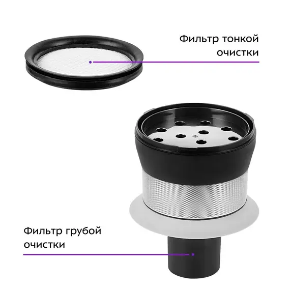 Пылесос оборудован современным циклонным фильтром, обеспечивающим хорошую очистку. Внутри пылесборника находится фильтр тонкой и грубой очистки с металлической сеткой, которые также легко можно вынуть и почистить.