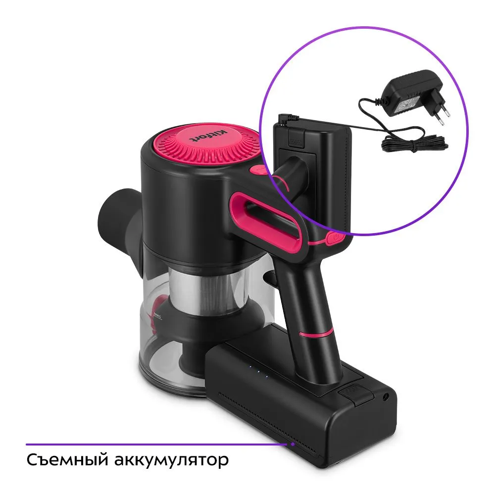 Беспроводной пылесос КТ-5281 очень удобен при оперативной уборке. Одно из главных его достоинств – компактность. Во время работы пылесос благодаря своей маневренности поможет легко убраться в узком коридоре или комнате, заполненной различными предметами.