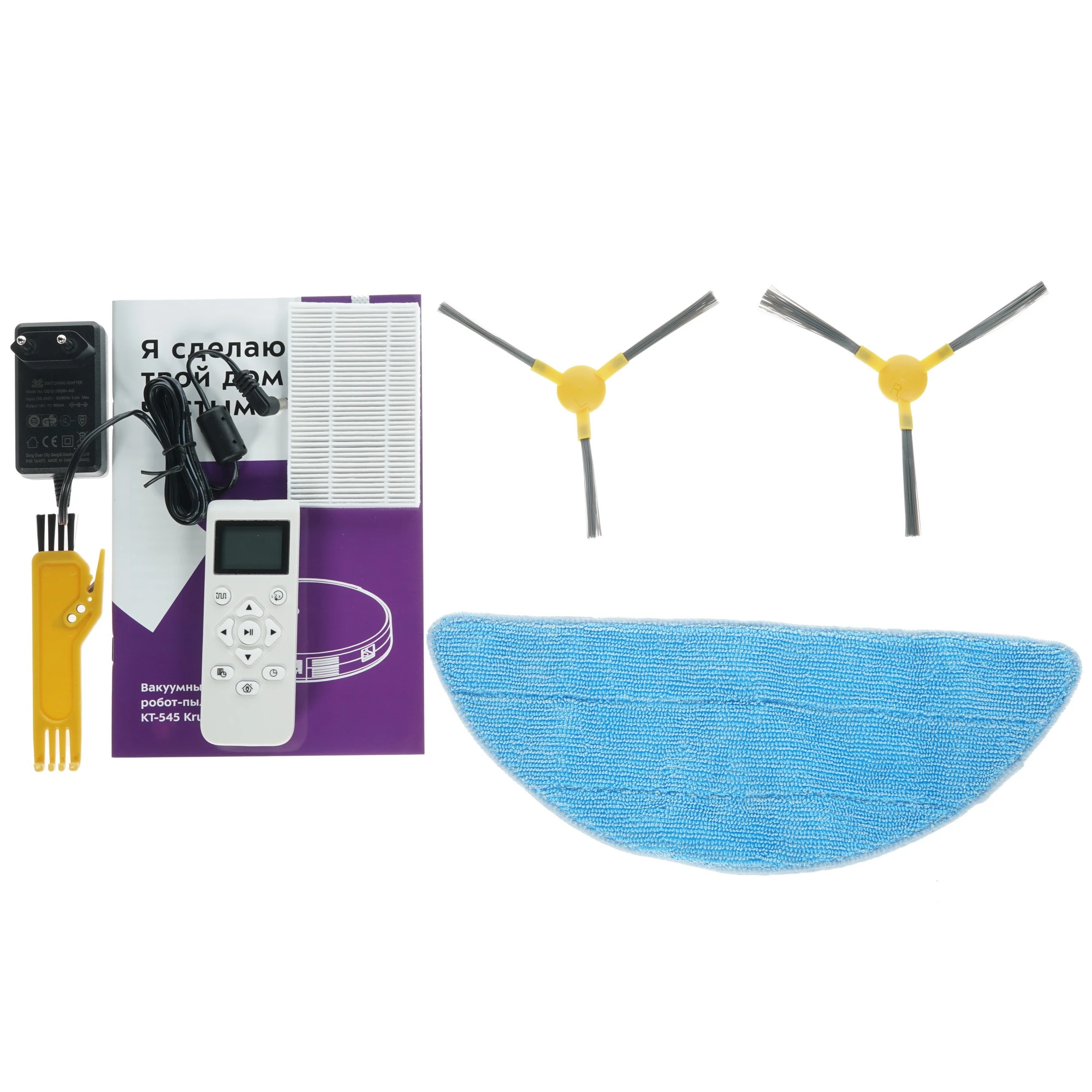 HEPA-фильтр х 2 шт, батарейки, блок питания, боковая щетка х 4 шт, док-станция, документация, ещё