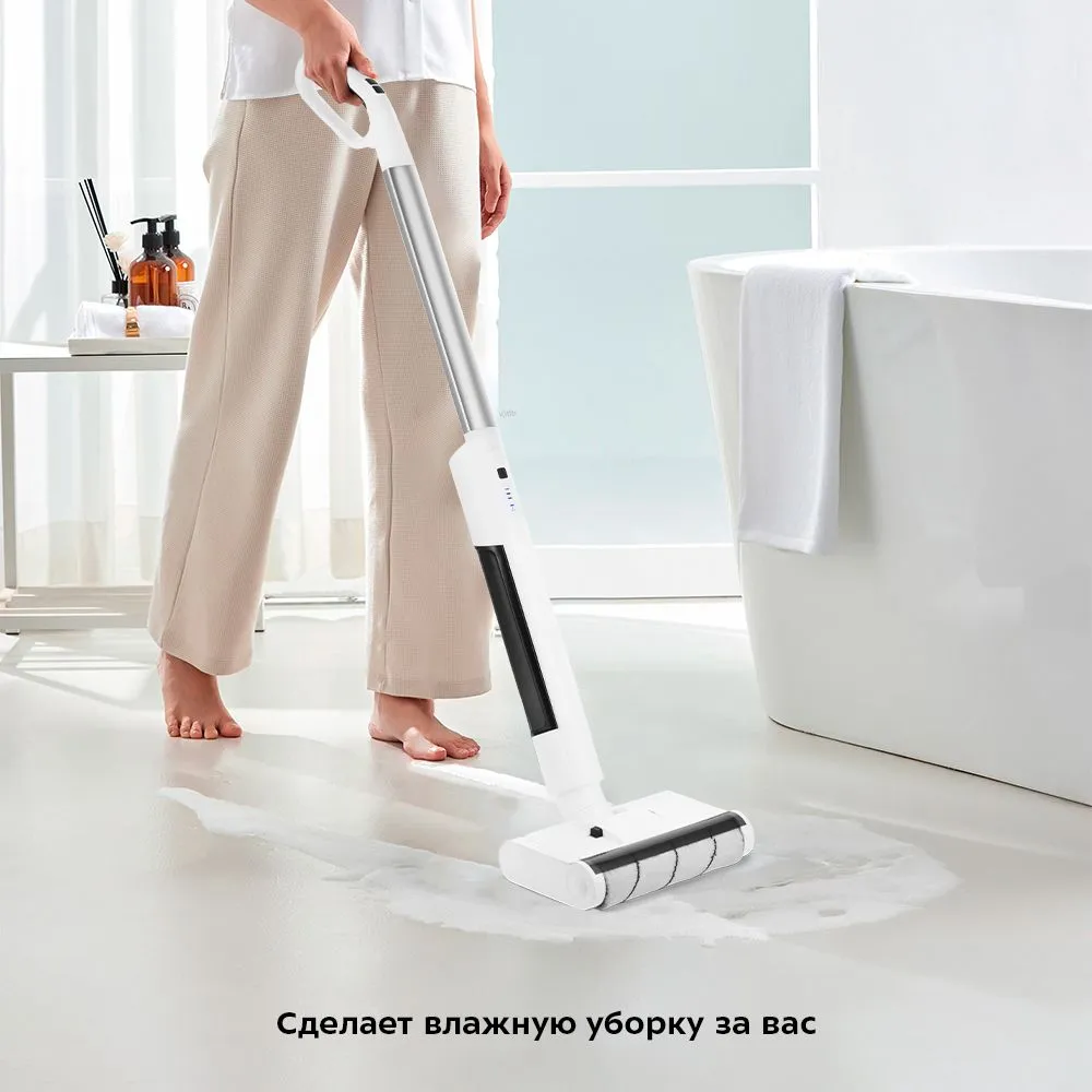 Швабра включается, когда находится в наклонном положении. Когда прибор включён, при нажатии на кнопку подачи воды в течение 5 секунд на валик подается вода и горит индикатор подачи воды. Индикатор заполнения резервуара мигает, если необходимо вылить воду.
