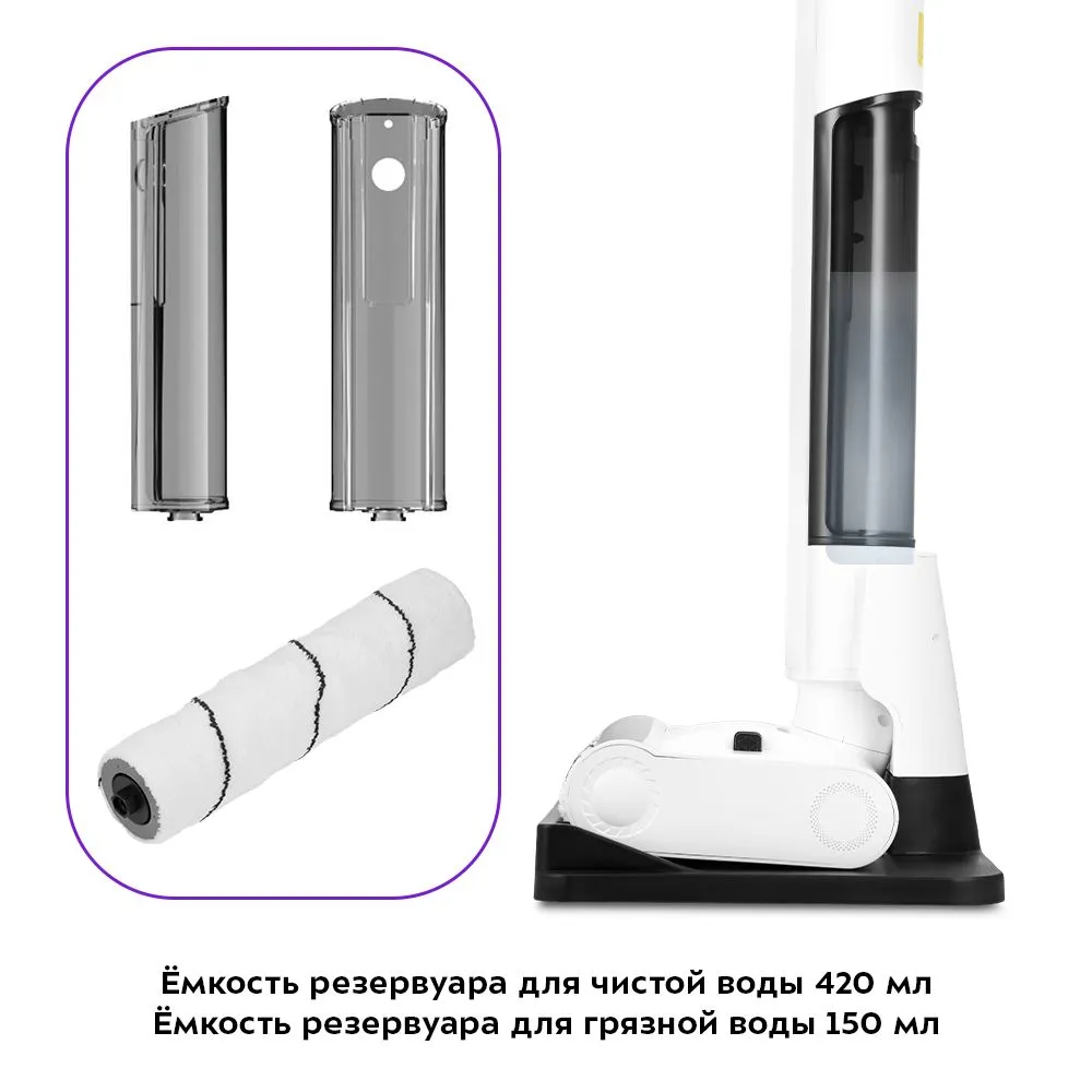 Резервуары для чистой и грязной воды съёмные, так что заливать воду и очищать прибор очень легко. Ёмкость резервуара для чистой воды 420 мл, для грязной — 150 мл. В комплект входят два валика, один из них является запасным.