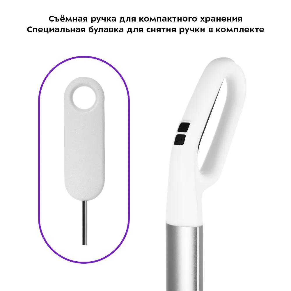 Конструкция швабры позволяет снять ручку для более компактного хранения. Для снятия в комплекте предусмотрена специальная булавка, чтобы было удобнее это сделать.