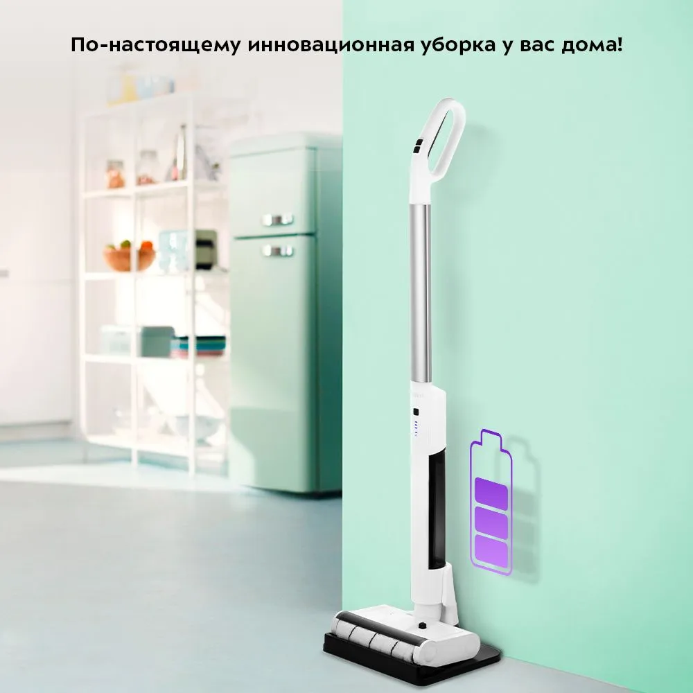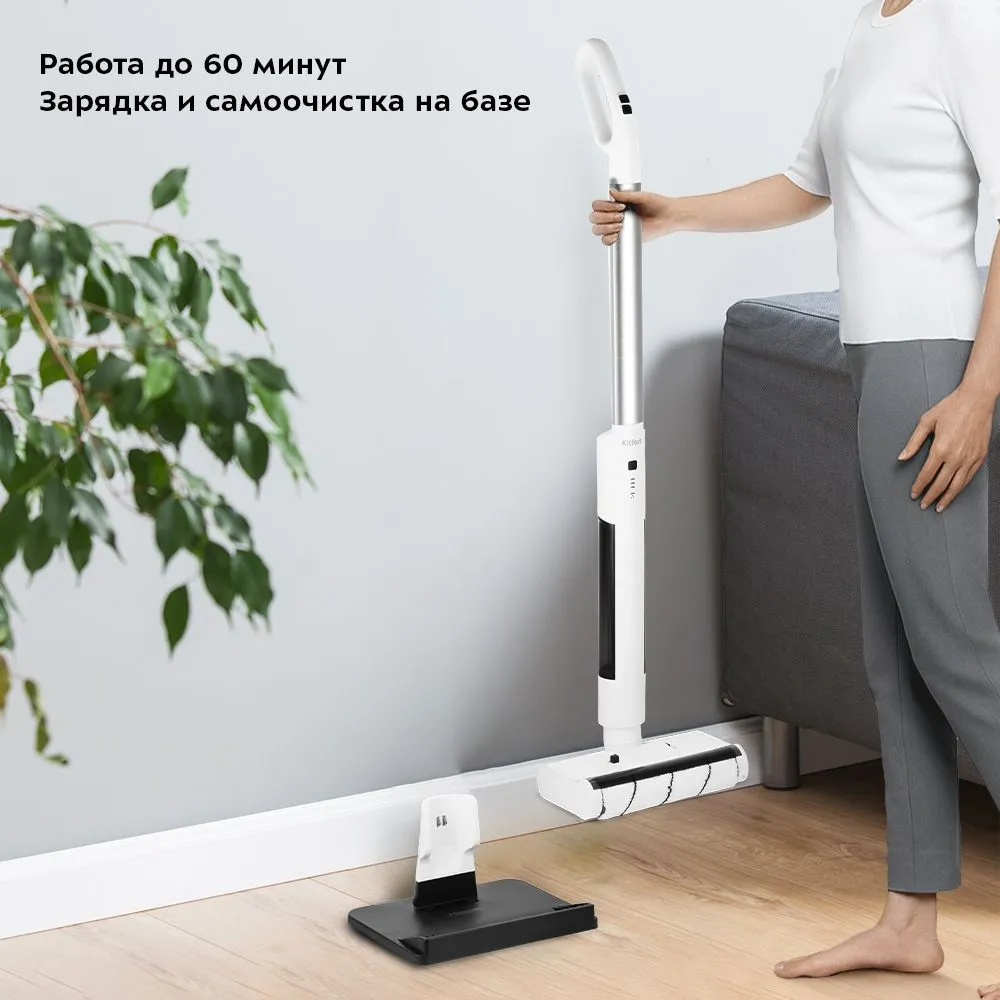 Для зарядки и самоочистки прибор устанавливается на базу. Электрошвабра работает от аккумулятора до 60 минут. Когда швабра подключена к сети, индикаторы показывают уровень зарядки прибора. Нажатие на кнопку самоочистки запускает эту функцию.