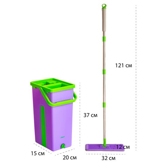 Состав набора: швабра, ведро с отжимом и полосканием, сменные насадки 2 шт.
