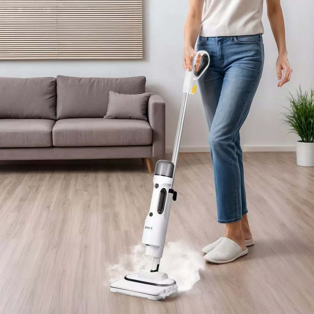 Паровая швабра «2 в 1» КТ-1062 — универсальное устройство, которое поможет избавиться от пыли и грязи с помощью мощной струи пара и продезинфицирует поверхность. Паровая швабра очистит раковину и плиту на кухне, зеркала и мебель исключительно паром.