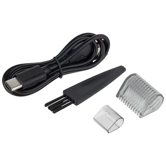 2Вт, работа от аккумулятора, лезвия из нерж.стали, 2 насадки, t работы 180мин, t зарядки 90мин, зарядка от USB (шнур в комплекте) , защитный колпачок, подсветка, щеточка