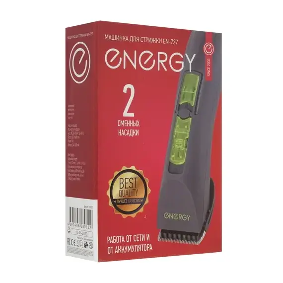 Машинка для стрижки ENERGY EN-727 обеспечивает качественные результаты стрижки и удобство в процессе эксплуатации. Настройка длины срезания выполняется за счет регулятора-рычага в пределах 1-6 мм и двух сменных насадок. Корпус эргономичной формы гарантирует комфортное удержание прибора. Машинка для стрижки ENERGY EN-727 работает на основе аккумулятора, одного полноценного заряда которого достаточно для 60 минут автономной работы. Для зарядки требуется около 6 часов. В наборе поставляются щетка для чистки, сетевой адаптер и масло для ухода за лезвиями.