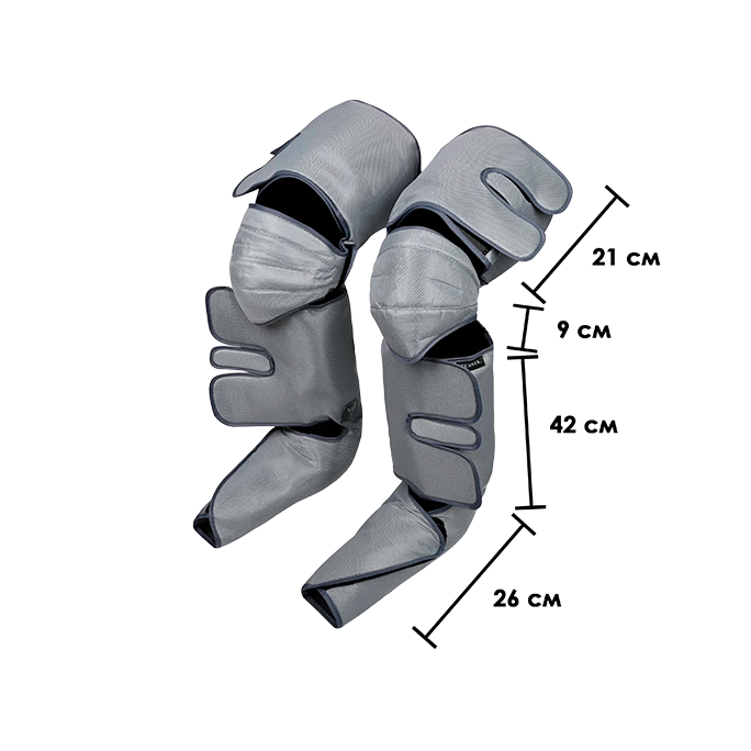 Отличительной особенностью является большая длина манжет, позволяющая провести комплексную прессотерапию и лимфодренаж в области бедер, икроножных мышц, лодыжек и стоп одновременно. Благодаря липучкам на манжетах достигается плотное обертывание и прилегание.