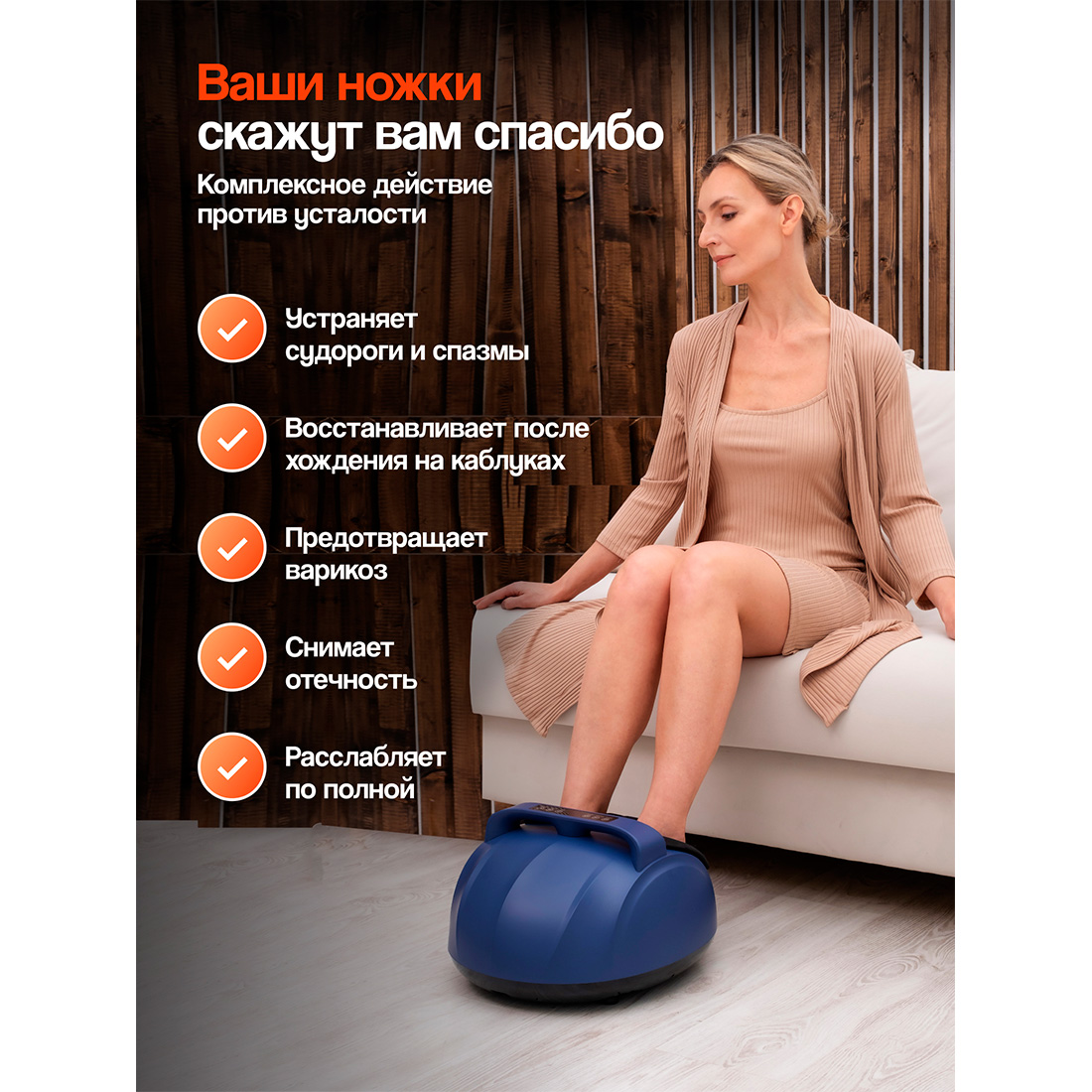 Электрический массажер для ног искусно объединяет целых 5 востребованных видов массажа: роликовый, акупунктурный, вибрационный, воздушно–компрессионный и комбинированный. Комплексное массажное воздействие на стопу обеспечивает интеллектуальный массажный механизм.