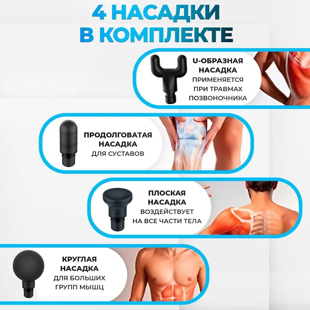 Массажный пистолет, 4 насадки, кабель для зарядки Type-C (адаптер в комплект не входит), мягкая сумка для переноски.
