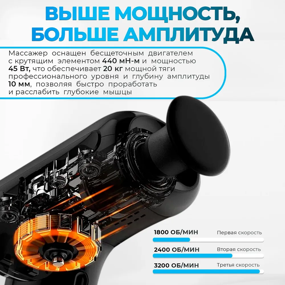 Благодаря сверхлегкой конструкции, вес массажера всего 600 грамм, вы можете брать его с собой на тренировки или на работу, чтобы при необходимости снять напряжение в мышцах.
