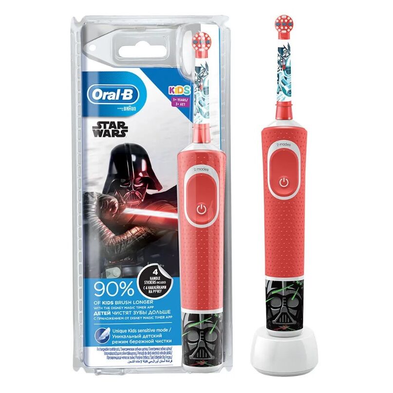 Электрическая зубная щетка Oral-B Kids для детей от 3 лет с веселыми героями мультфильма "Звездные Войны" обеспечивает эффективный бережный уход за полостью рта ребенка от Oral-B. Она удаляет больше зубного налета по сравнению с обычной мануальной зубной щеткой. В комплект входят 4 стикера с героями мультфильма "Звездные Войны", с помощью которых можно персонализировать зубную щетку.•7600 возвратно-вращательных движений в минуту.