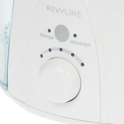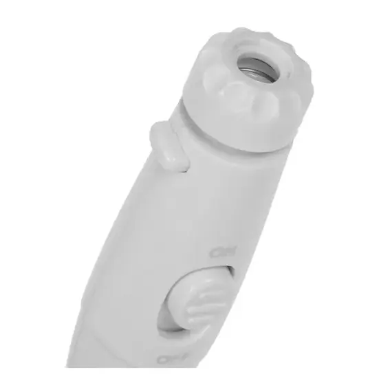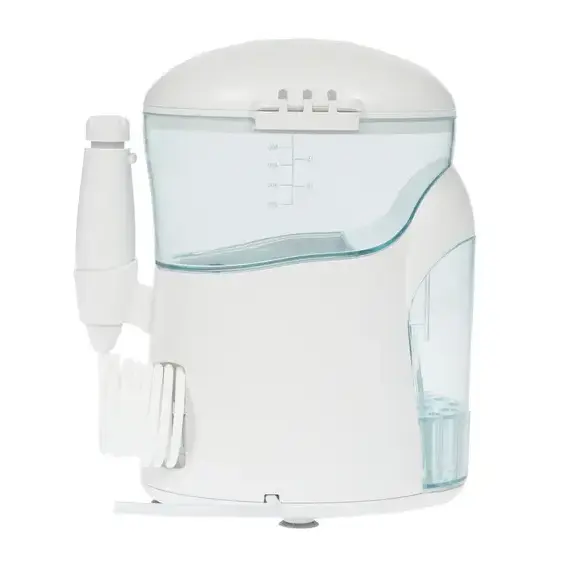 Ирригатор стационарного типа облачен в белый пластиковый корпус с резервуаром для жидкости объемом 600 мл.