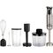 насадка-блендер (4 лепестка из нержавеющей стали), венчик, насадка для вспенивания молока, насадка для пюре, мерный стакан (0.7), крышка к стакану, измельчитель, чаша