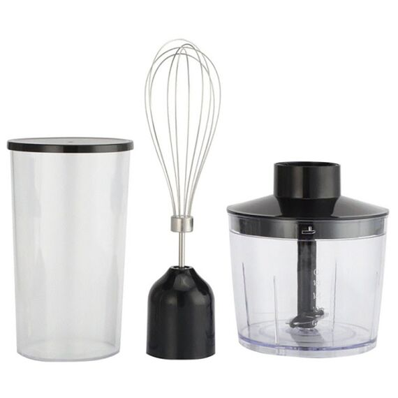 блендер, насадки, мерный стакан с крышкой, измельчитель, чаша для измельчения, нарезки и терки, гарантийный талон, инструкция на русском языке