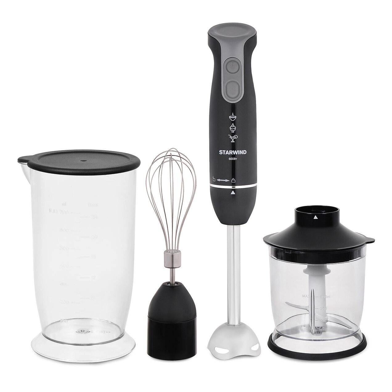 венчик для взбивания, документация, мерный стакан, насадка-блендер, чаша для измельчения
