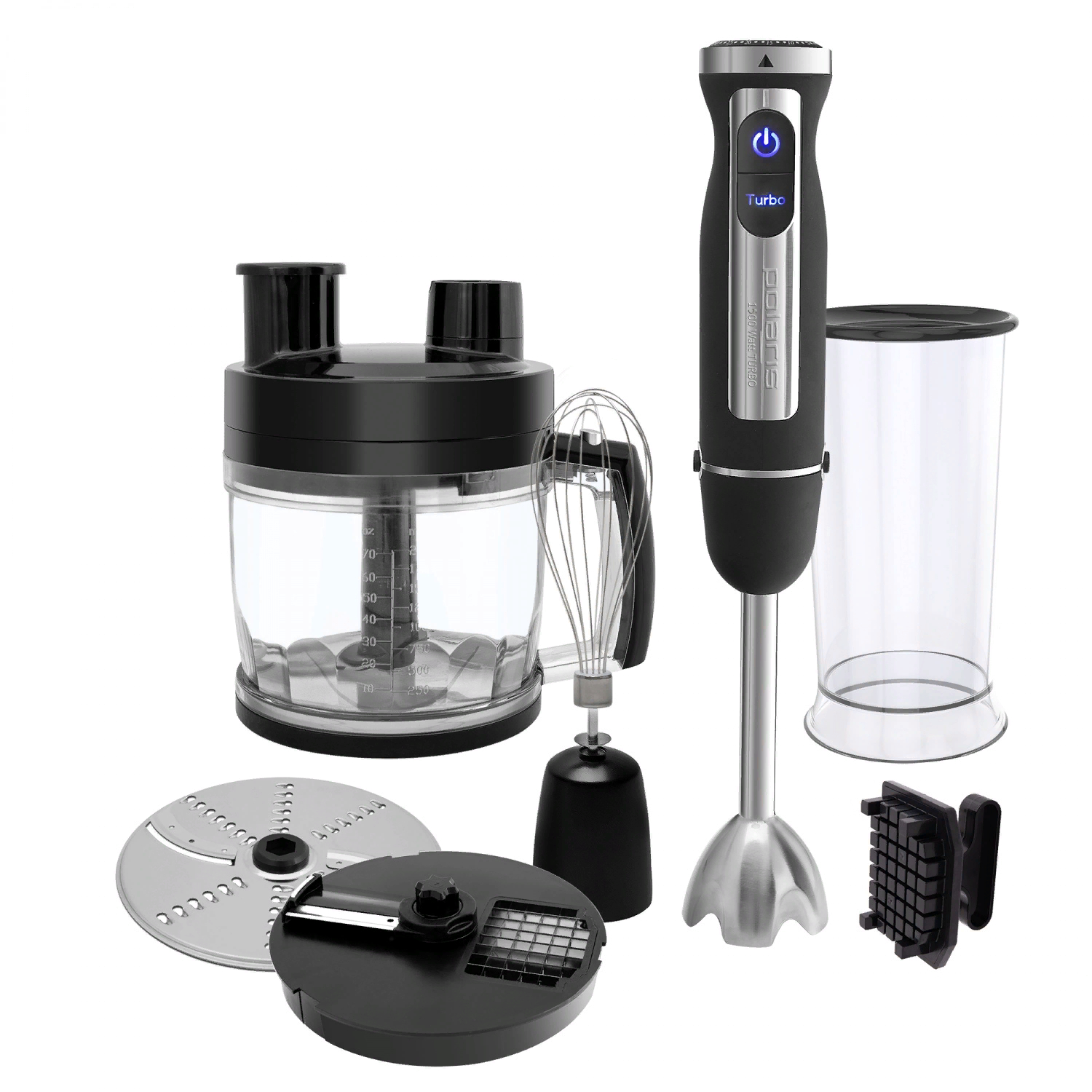 Количество приборов - 5 в 1: измельчитель, блендер, миксер, насадка для резки кубиками, диск для нарезки ломтиками/шинковки