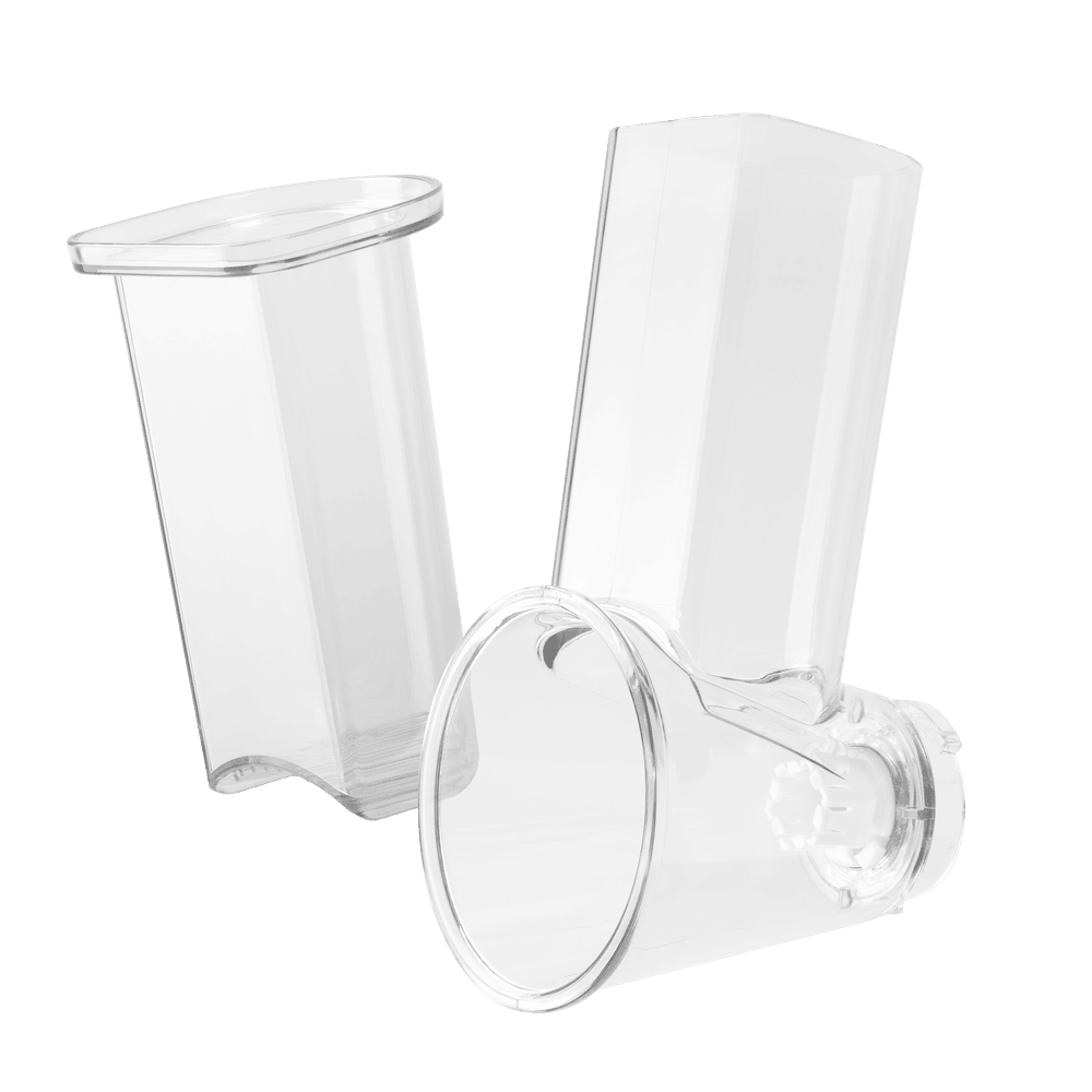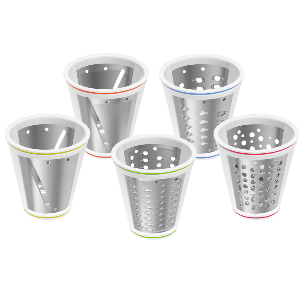 Комплектация 3 терочных (крупная терка, средняя терка, мелкая терка) и 2 шинковочных ножа (крупная шинковка, мелкая шинковка), толкатель