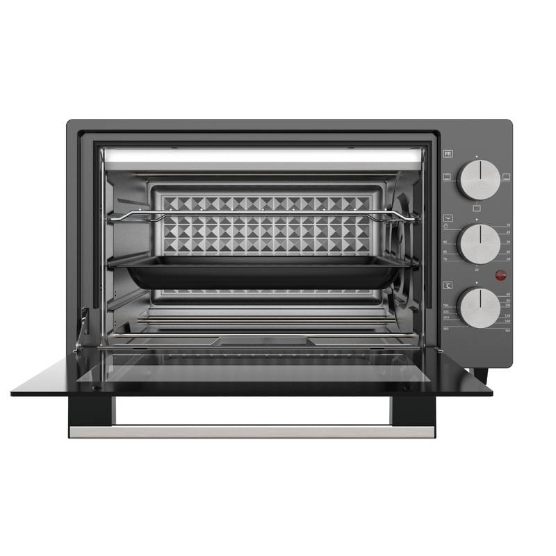 Комплектация мини печь; 1 стандартный эмалированный квадратный противень; 1 решетка; 1 эмалированный круглый противень; документация