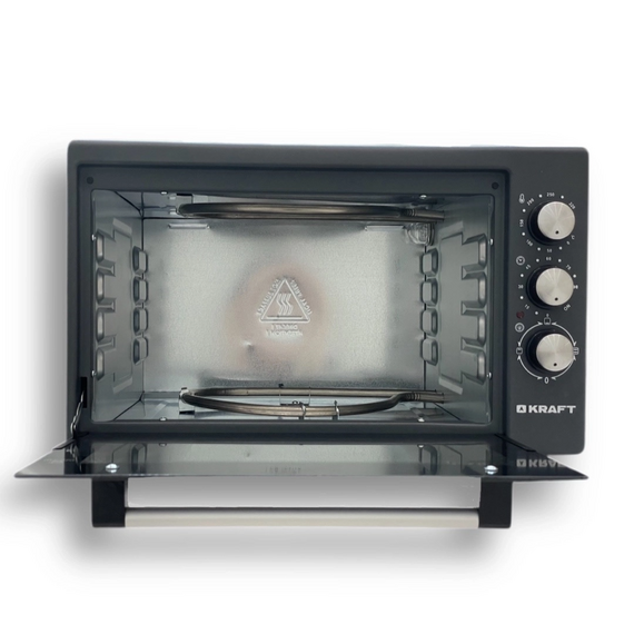 Электрическая духовка Kraft KF-MO 3800 DGR выполнена в темно-сером металлическом корпусе и имеет внутреннюю камеру объемом 38 л, позволяя готовить различные блюда быстро и удобно. В печи предусмотрено 3 стандартных режима нагрева – нижний, верхний и двухсторонний. Температура приготовления блюд регулируется в диапазоне от 50 °C до 320 °C. Также имеется таймер обратного отсчета на 90 минут. Мини-печь выполнена в термоизолированном корпусе с откидной стеклянной дверцей. Рядом с дверцей расположены 3 поворотных переключателя для управления режимом нагрева, временем и температурой. В комплект входят прямоугольный противень для выпечки и решетка