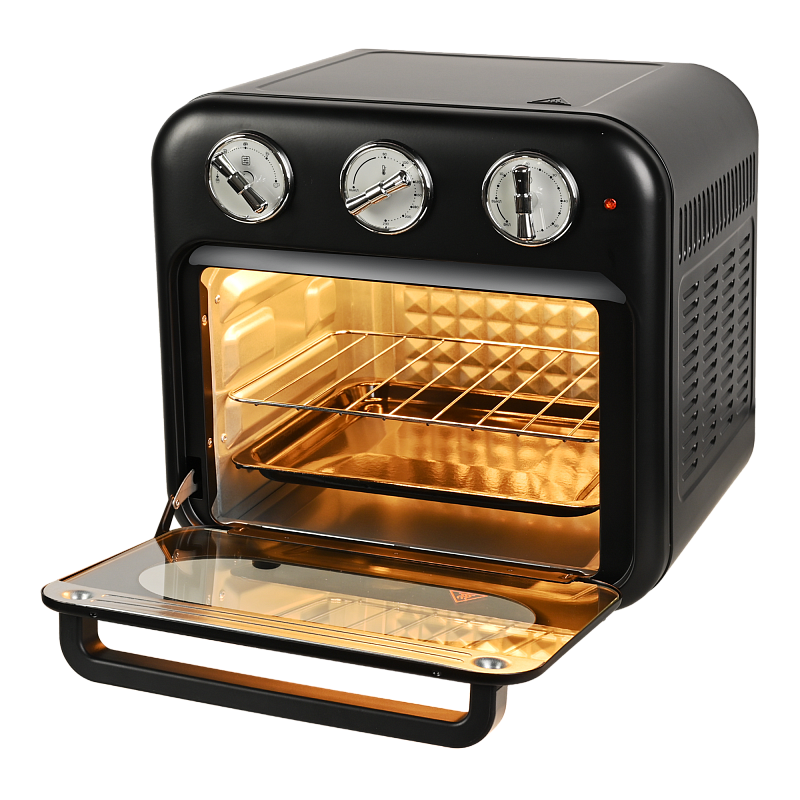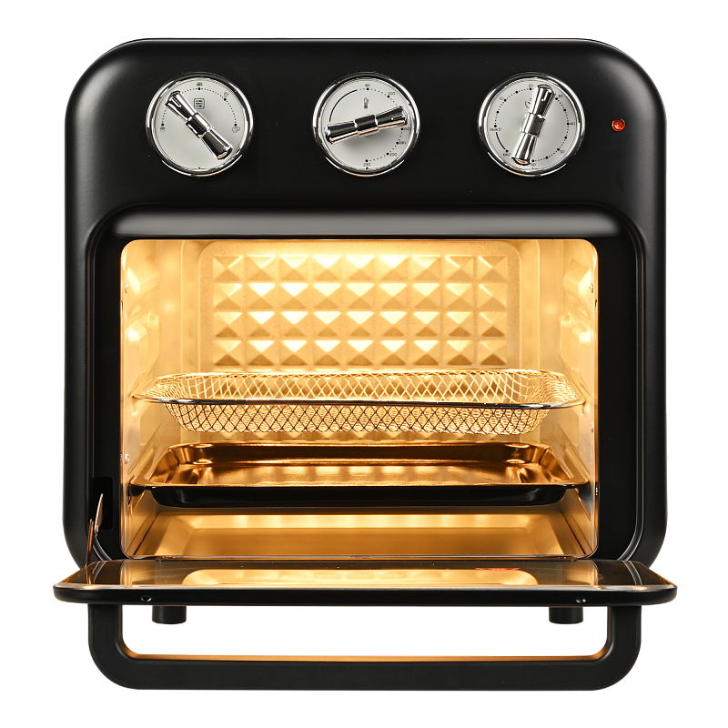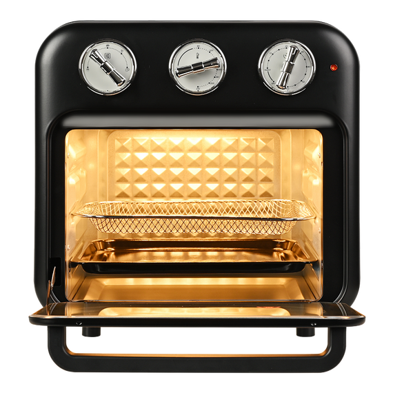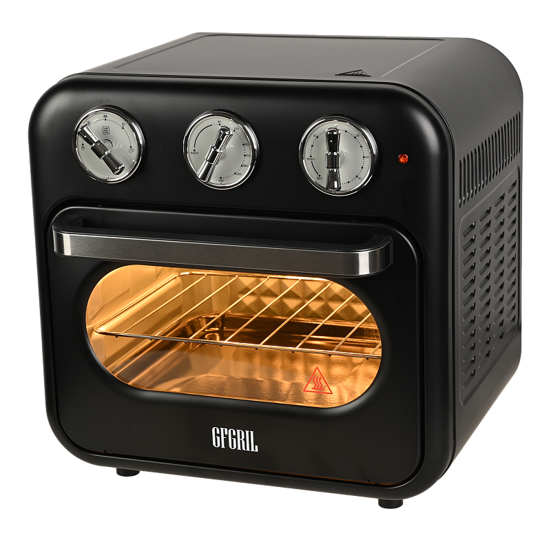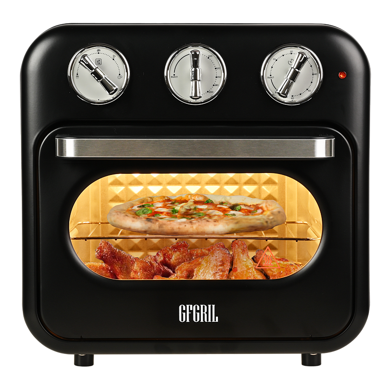 Многофункциональный аэрогриль печь c конвекцией GFAO-200 подойдет всем, кто не хочет тратить много времени на приготовление пищи, но при этом хочет питаться вкусно и полезно. Настольная мини печь электрическая имеет компактный размер (34,0*33,7*33,8 см) и стильный ретро дизайн, которые делают аэрогриль интересным предметом интерьера. Аэрофритюрница имеет объем внутренней камеры - 16 л, благодаря этому аэрогриль электрический GFAO-200 может стать полноценной альтернативой крупногабаритной духовки. В комплект аэрогриля входят противень, решетка для запекания и корзина для фритюра. Такое многообразие аксессуаров позволит не только запекать блюда, но и приготовить шашлыки, картофель фри и множество других блюд.