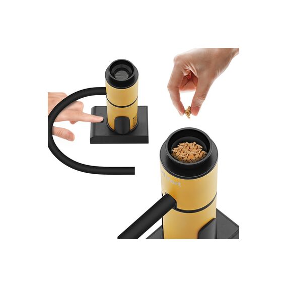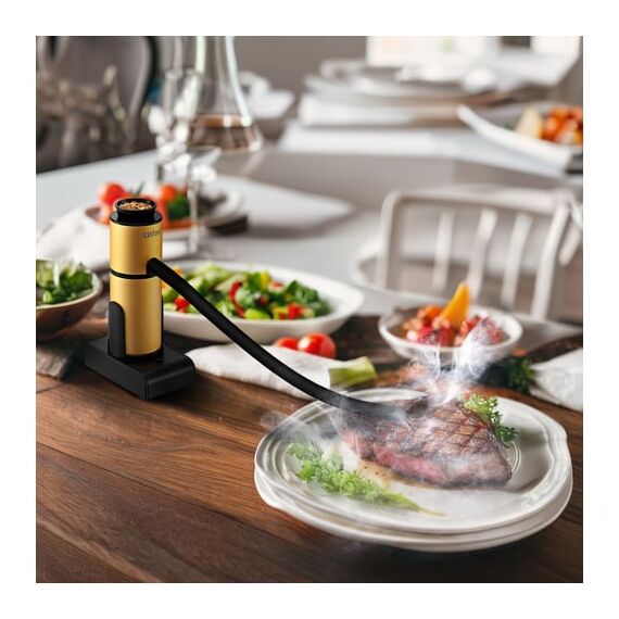 Благодаря широкому основанию дымогенератор устойчиво стоит на столе, а эластичная коптильная трубка позволяет окуривать продукты в любой посуде. Вы можете разместить дымогенератор на столе и окуривать блюдо в тарелке, кастрюле, пакете, стакане, под крышкой клош и даже в блендере при приготовлении коктейлей.