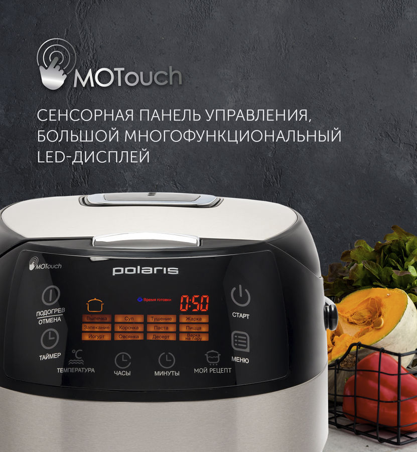 Программы приготовления: мультиповар (ручная установка времени и температуры), выпечка, суп, тушение, жарка, запекание, плов, паста, пицца, йогурт, овсяная каша, варенье, варка на пару, бобы, молочная каша, крупа, подогрев готовых блюд