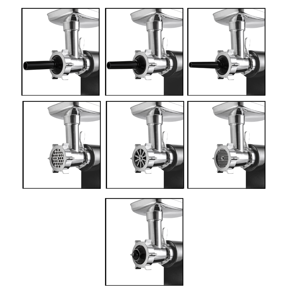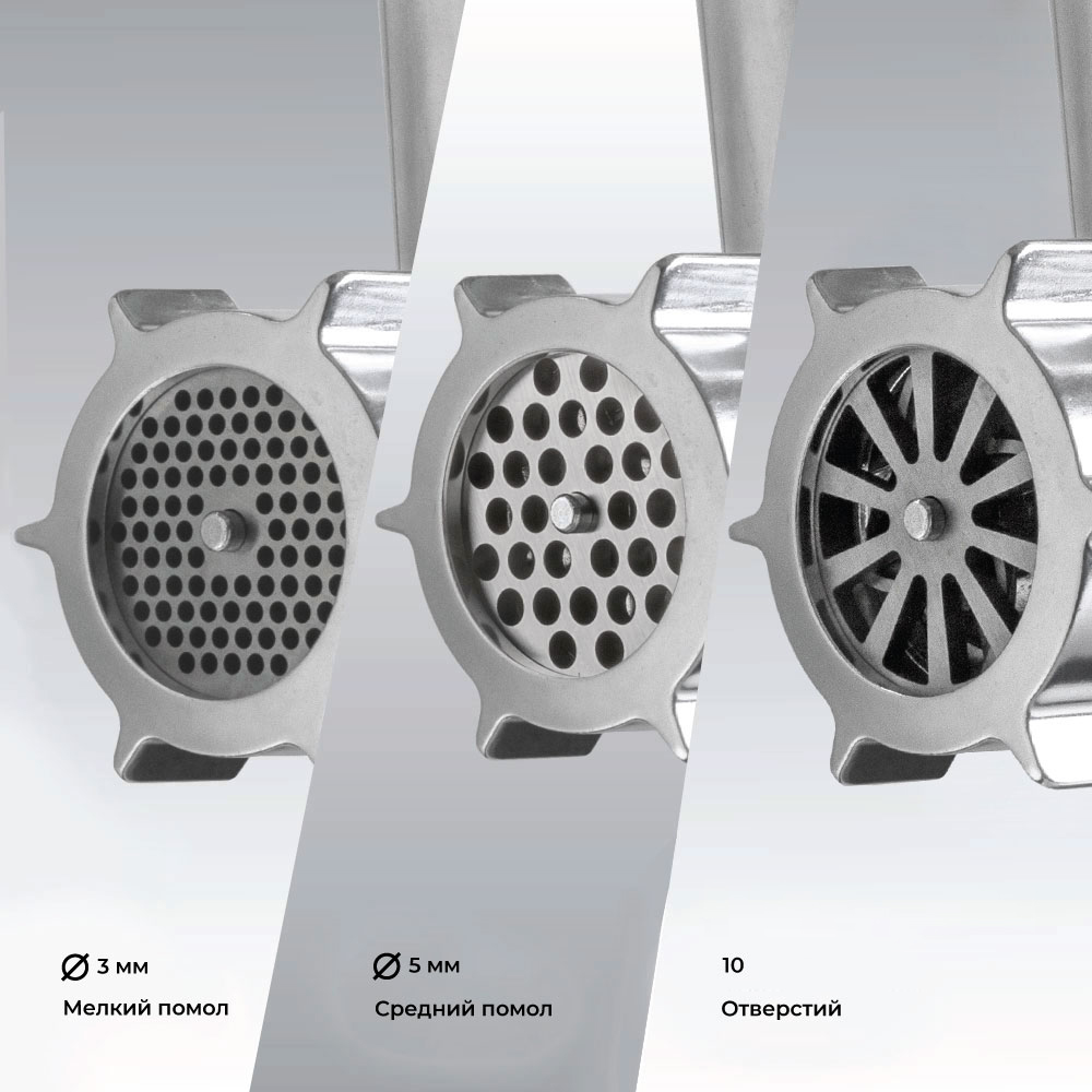 Мясорубка, Кованый стальной нож, 3 решетки с отверстиями 3 мм, 5 мм, 10 отверстий, Насадки для приготовления кеббе и колбас, Толкатель, Руководство по эксплуатации