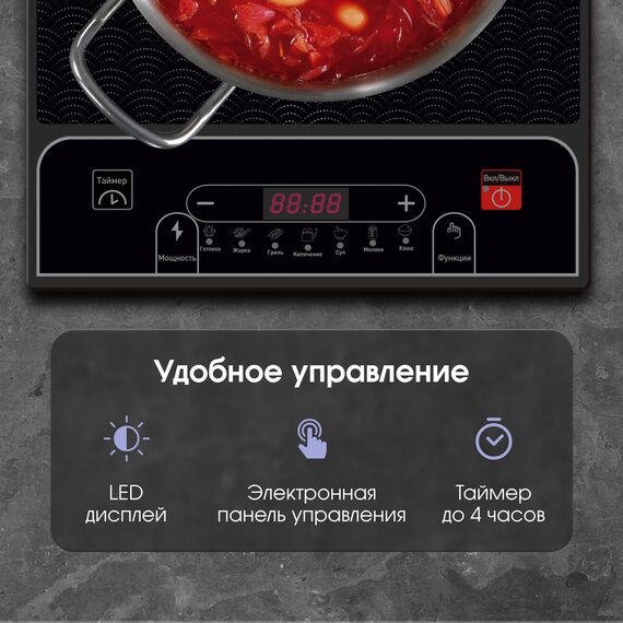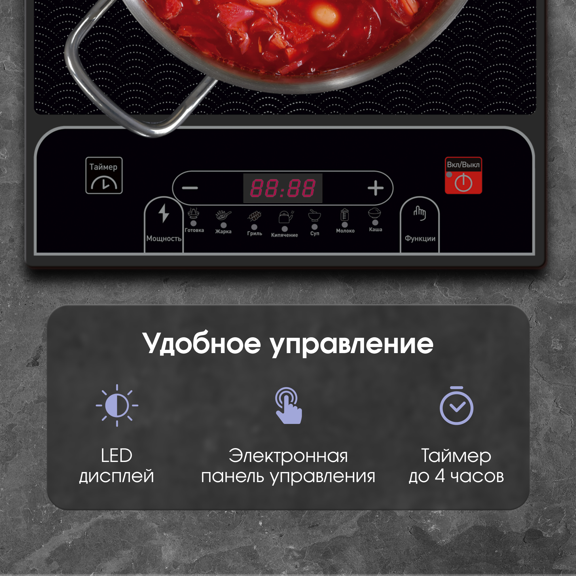 Функциональные особенности таймер до 4-х часов, нагревается только посуда