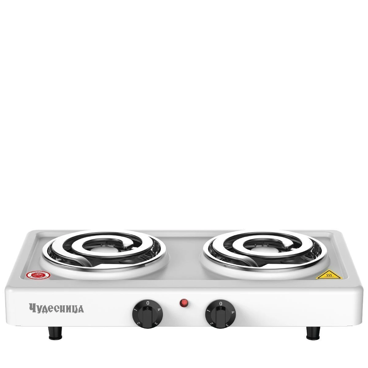 Плитка электрическая Чудесница ЭЛП-814 с 2-мя конфорками, цвет белый , мощность 1000+1000 Вт, спираль- нагревательный элемент, плавная регулировка температуры, прочное легкоочищаемое термостойкое эмалевое покрытие, защита от перегрева, световой индикатор работы
