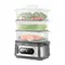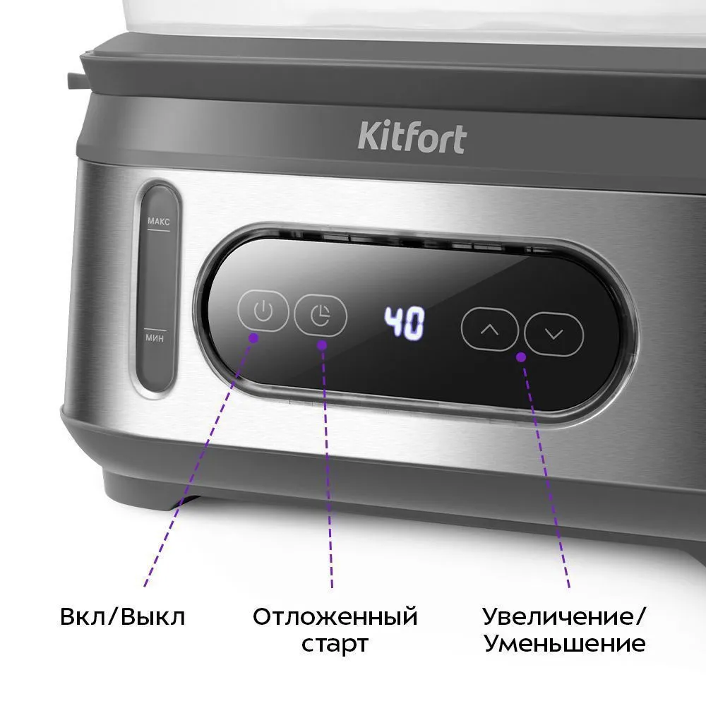 Пароварка оснащена современной панелью управления. Дисплей показывает время до окончания работы. «Отложенный старт» устанавливает время, когда прибор начнёт работу. Кнопки уменьшения и увеличения регулируют время приготовления и время отложенного старта.