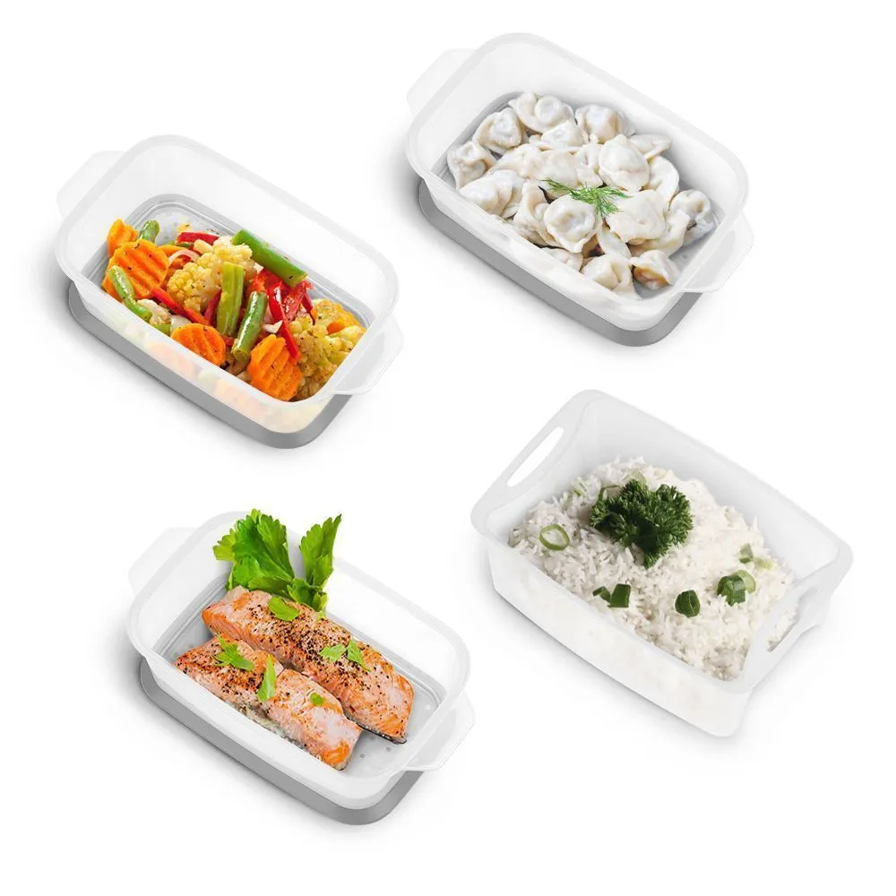 Паровые корзины и чаша для риса выполнены из пластика. В пароварке можно легко готовить мясо, рыбу и овощи. В специальной чаше для риса (корзина без перфорации) вы сможете готовить каши, супы, пудинги и йогурты.