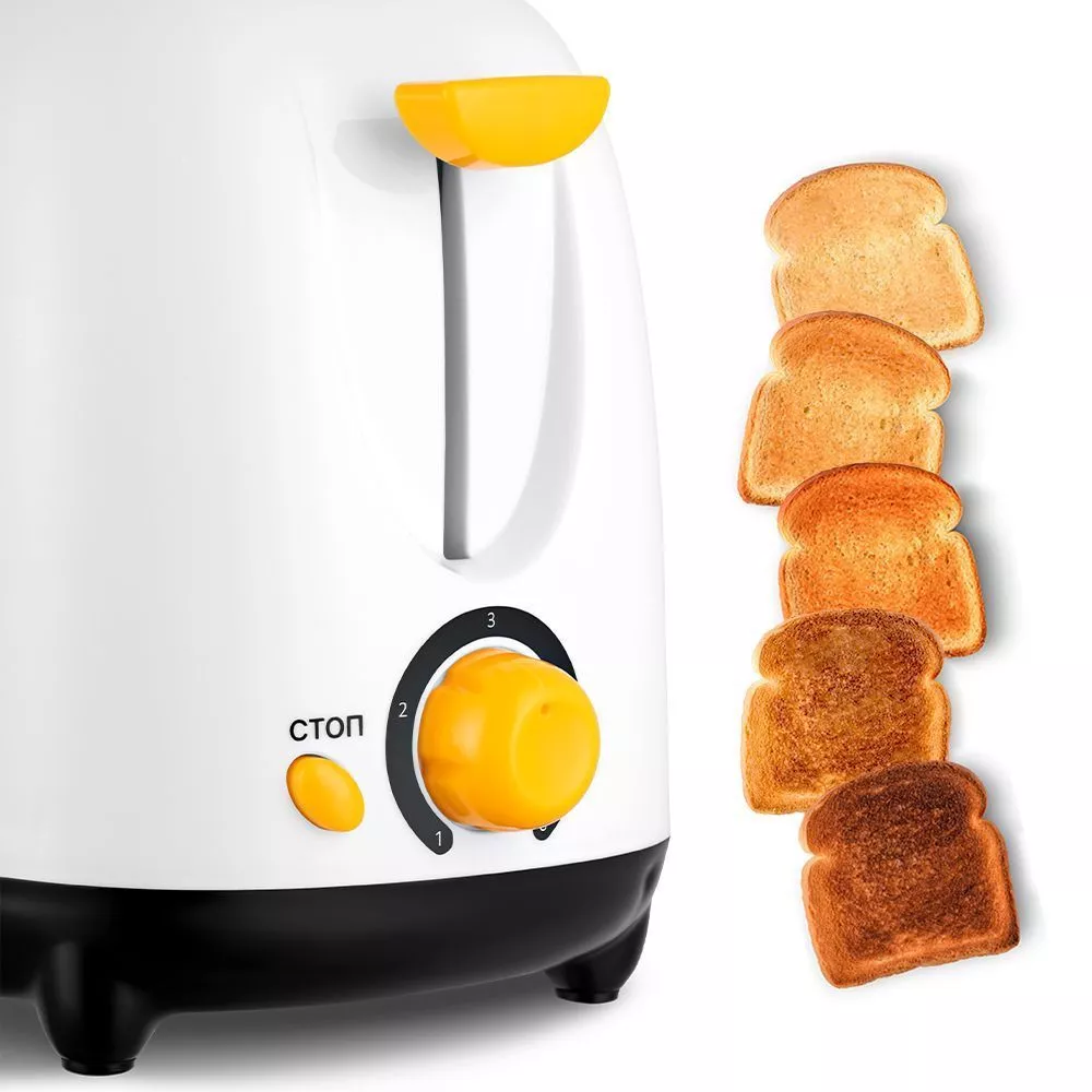 Тостер оснащён поворотным регулятором степени обжаривания и кнопкой «Стоп», которая позволяет отключить приготовление раньше автоматического отключения. 5 режимов работы позволяют получить именно тот хруст и румяность хлеба, который любите именно вы!