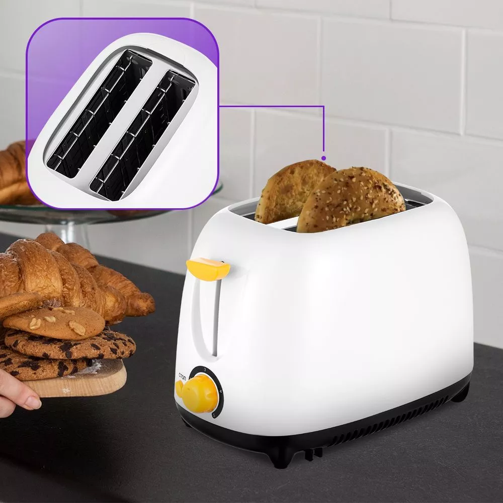 Загруженные тосты автоматически центрируются, чтобы их обжарка с 2 сторон была равномерной. Благодаря широким слотам можно обжаривать толстые куски хлеба, половинки круассанов, бейглов и другие хлебобулочные изделия.