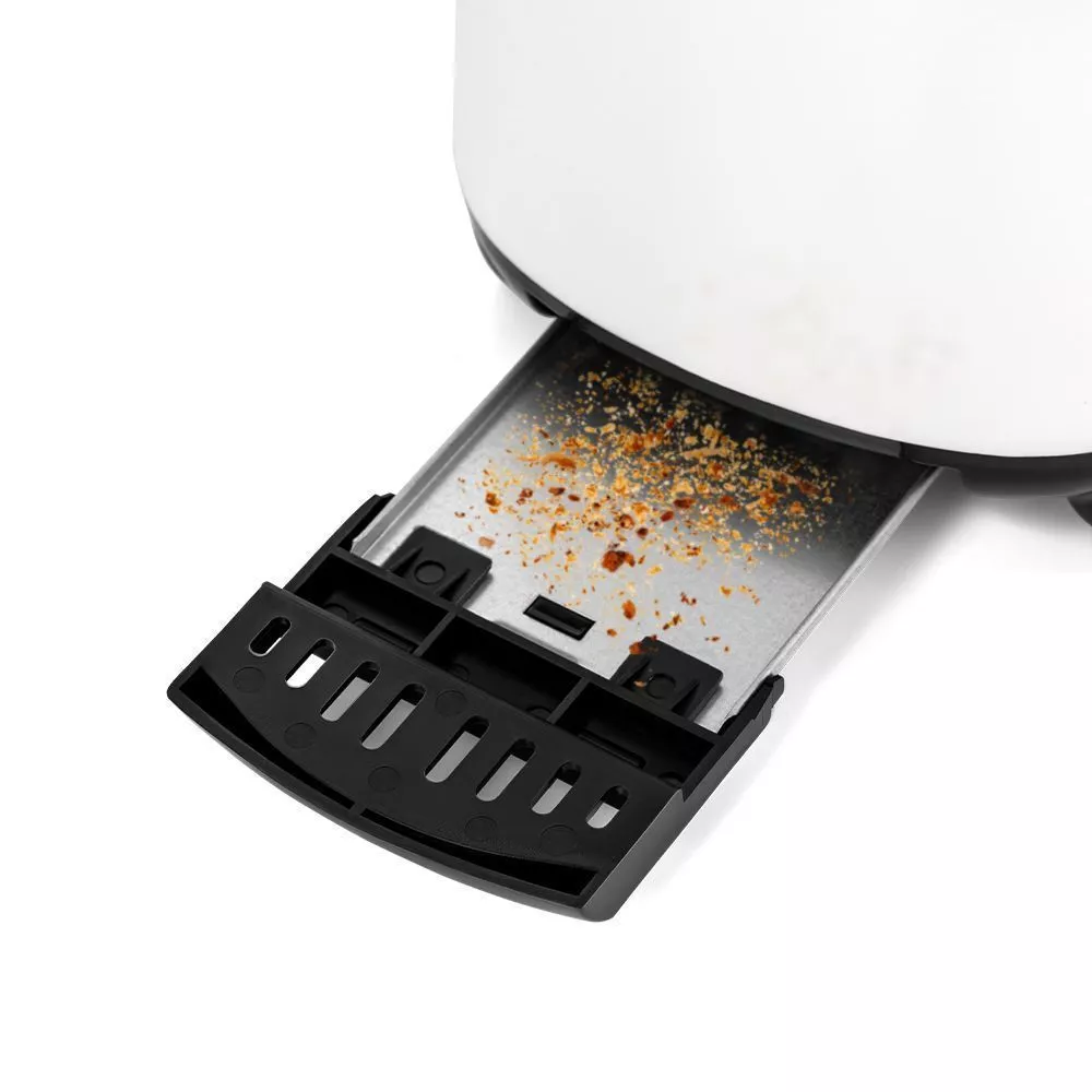В нижней части корпуса тостера расположен съёмный поддон для сбора крошек. Просто выдвиньте его и выбросите скопившиеся крошки, а остатки соберите салфеткой.