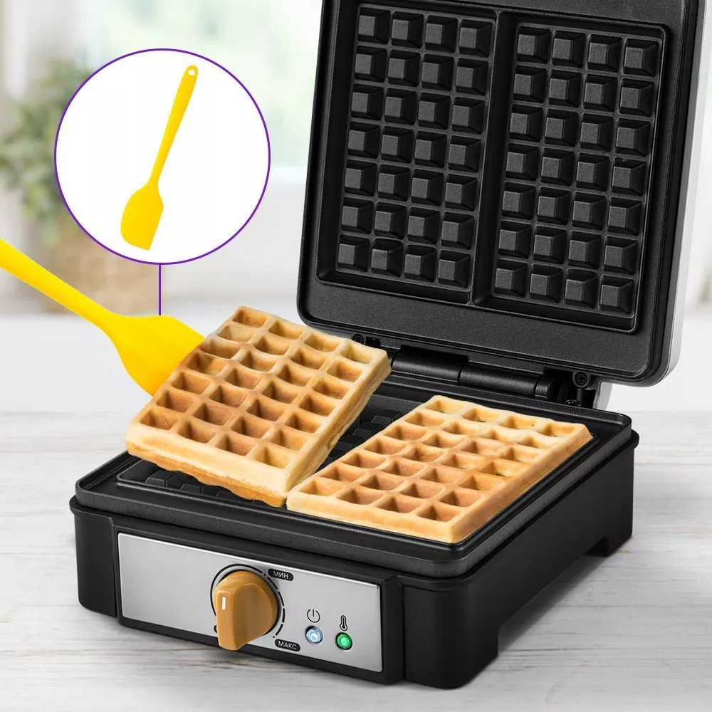 В комплекте к прибору идёт силиконовая лопатка, которая является универсальной кухонной принадлежностью. При помощи лопатки можно легко снимать готовые вафли с формы.