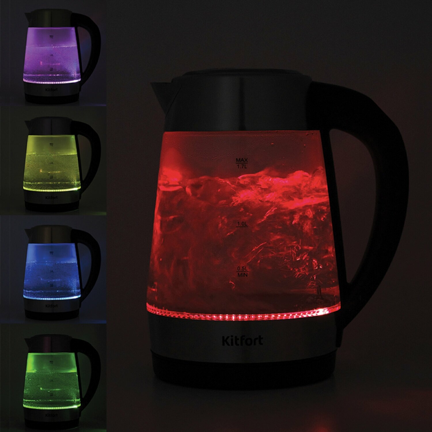 При включении чайника по периметру дна загорается подсветка, которая является индикатором работы и одновременно художественно подсвечивает воду разными цветами.