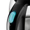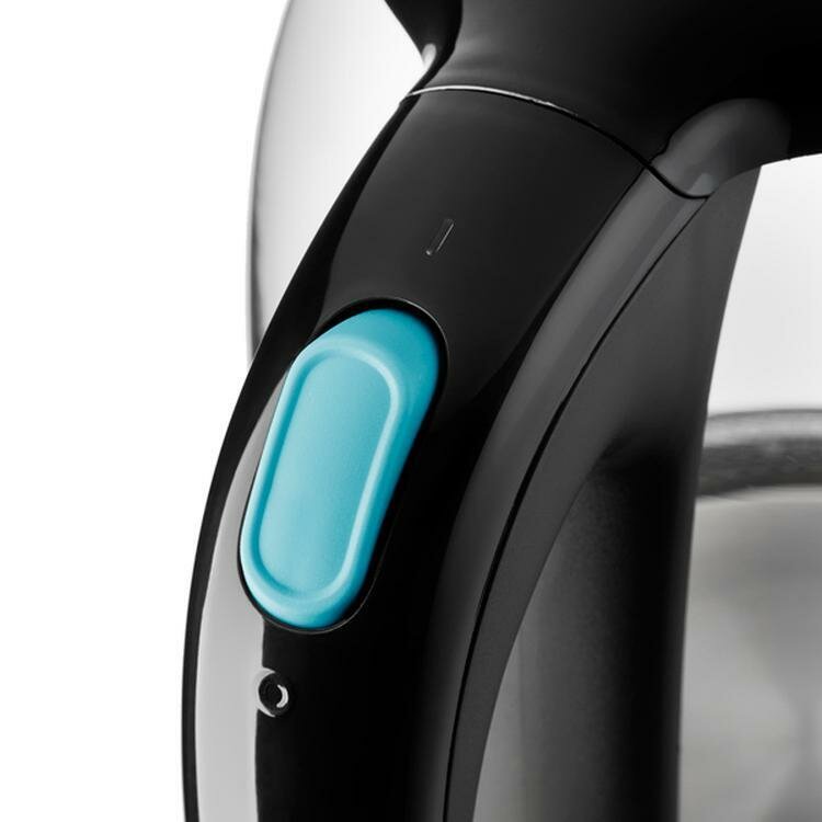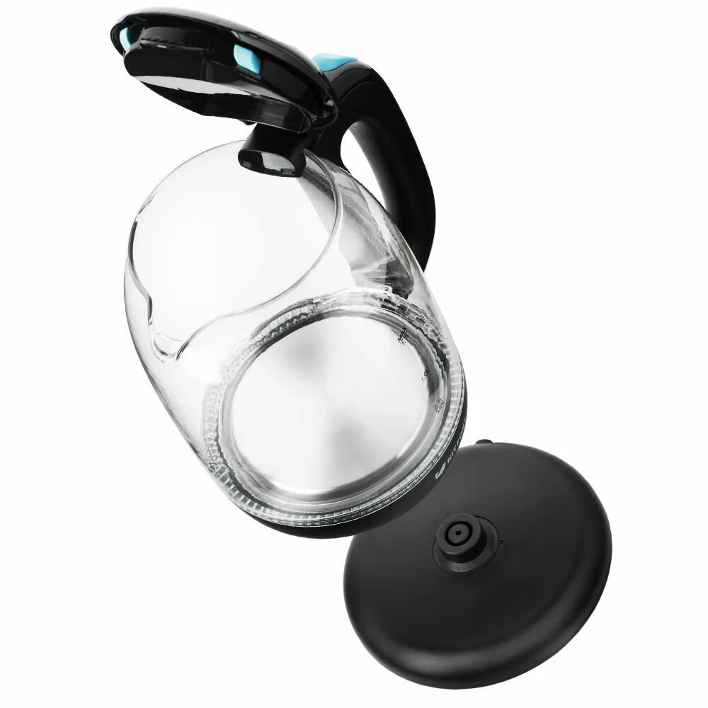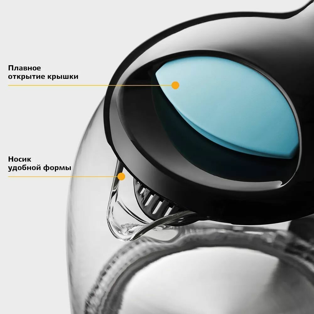 Корпус чайника выполнен из стекла, а крышка и подставка — из пластмассы. Мерная шкала нанесена на прозрачную часть корпуса. Подставка с центральным контактом дает возможность располагать на ней чай ник в любом положении, обеспечивая вращение на 360°.