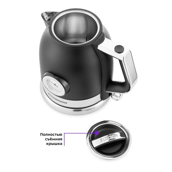 Для максимально лёгкого мытья и удобного заливания воды чайник оснащён целиком съёмной крышкой и широким горлышком.