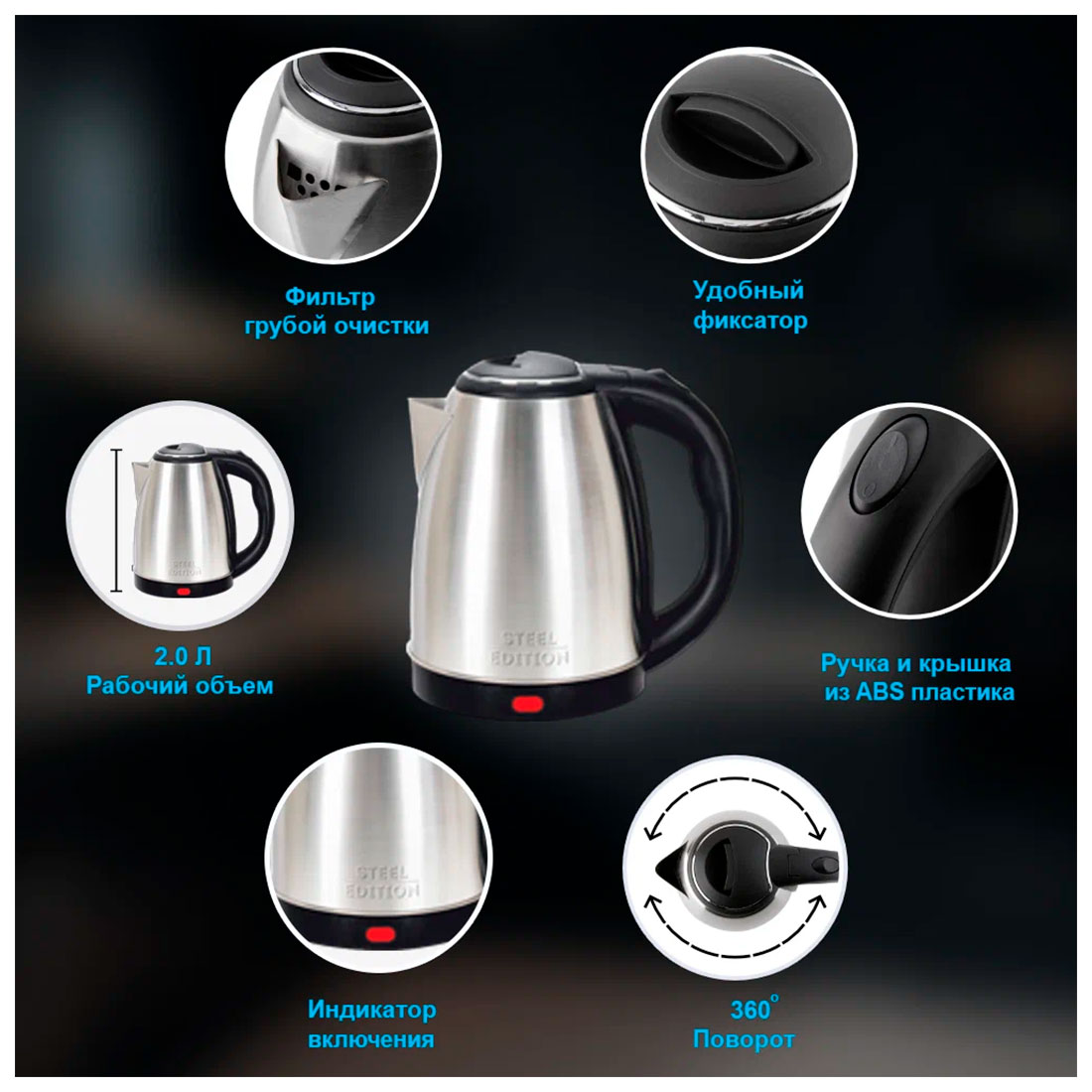 Электрический чайник SteelEdition A05 - это сочетание стиля и функциональности. Выполненный в черном и серебристом цвете, он станет стильным дополнением к вашему кухонному интерьеру.
