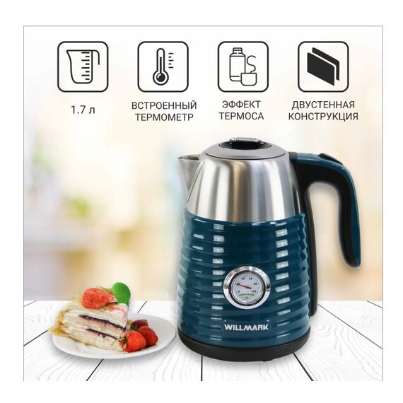 Чайник WILLMARK WEK-1738PST современный чайник с удобной ручкой, мощностью 2200Вт, объёмом 1,7 литра,с закрытым нагревательным элементом из нержавеющей стали. Удобен в эксплуатации, позволяет легко контролировать температуру воды благодаря встроенному термометру. Чайник электрический WEK-1738PST имеет двухстенную конструкцию, в которая наружняя часть выполнена из экологически безопасного пищевого пластика, внутренняя - из нержавеющей стали. Благодаря такой конструкции наружная поверхность чайника не нагревается, а при нагреве воды существенно снижается уровень шума и срок закипания. Технология термоса с двумя стенками позволит воде дольше оставаться горячей и снизит затраты на электроэнергию.