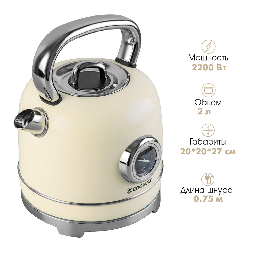 Беспроводное соединение позволяет вращать чайник на подставке на 360 градусов, Корпус из нержавеющей стали, Встроенный термометр, Автоотключение при закипании и отсутствии воды, Шкала уровня воды, Защита от перегрева, Скрытый нагревательный элемент, Фильтр-сетка для защиты от накипи, Отсек для хранения шнура